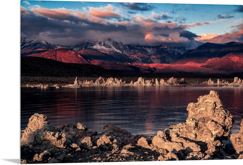 <p>Tufa rock formations around the edge of Mono Lake, with the Sierra Nevada mountains in the distance.</p>