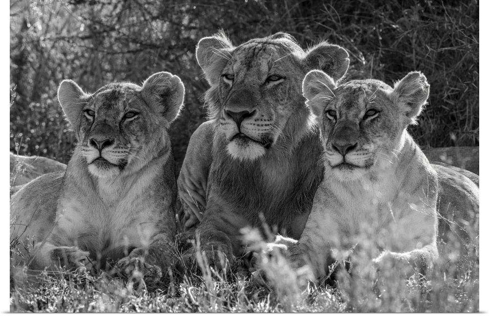 <p>Monochromatic male Lion (Panthera Leo) lies between two females; Kenya</p>