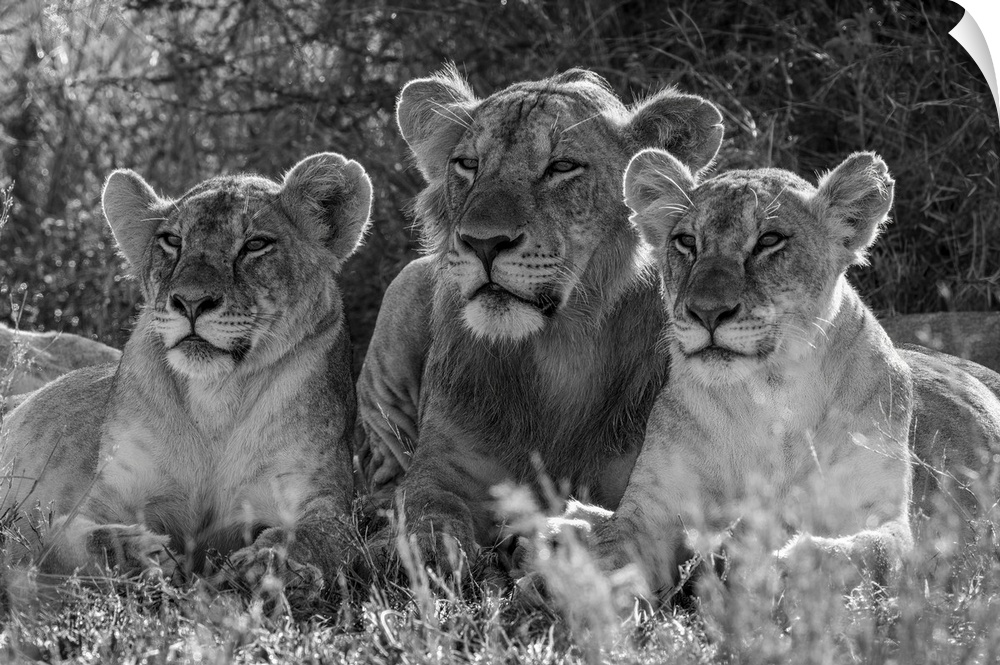 <p>Monochromatic male Lion (Panthera Leo) lies between two females; Kenya</p>