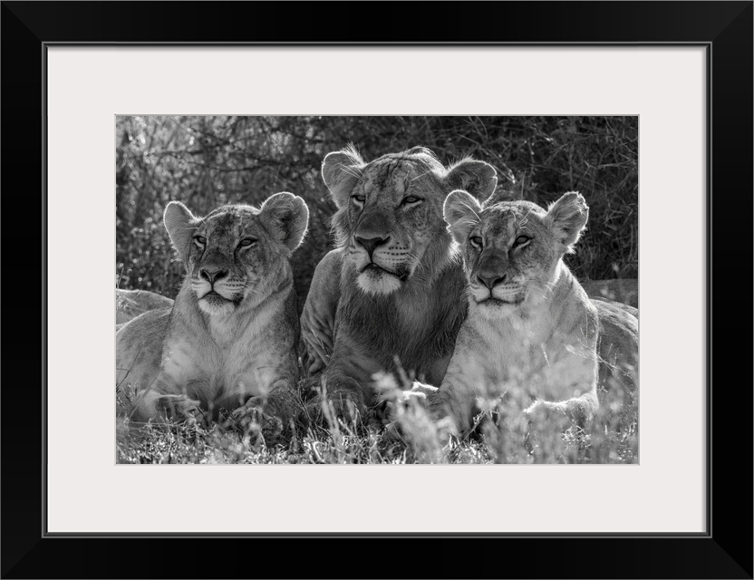 <p>Monochromatic male Lion (Panthera Leo) lies between two females; Kenya</p>