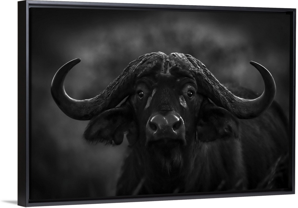 <p>Monochrome close-up of Cape buffalo (Syncerus caffer) in dark, Serengeti National Park; Tanzania</p>