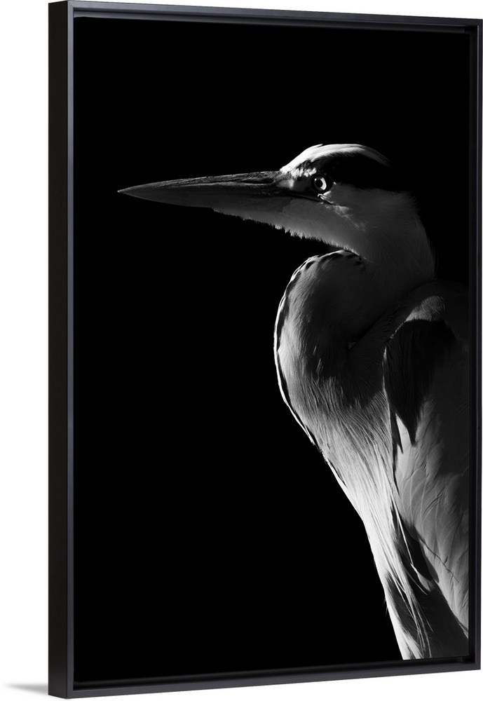 <p>Monochrome close-up of grey heron (ardea cinerea) in profile against a black background, England.</p>