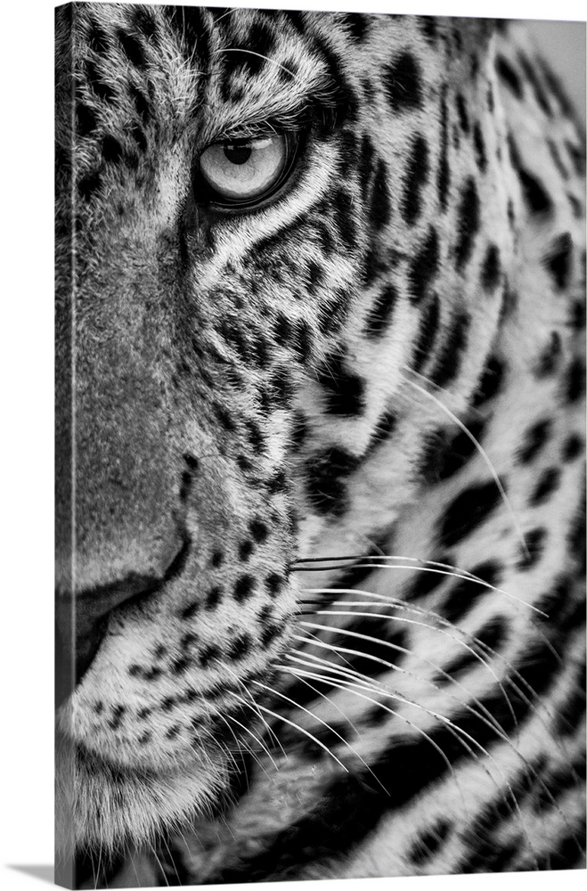 <p>Monochrome close-up of half male leopard (panthera pardus) face. Cottar's 1920s safari camp, Maasai mara national reserve, Kenya.</p>