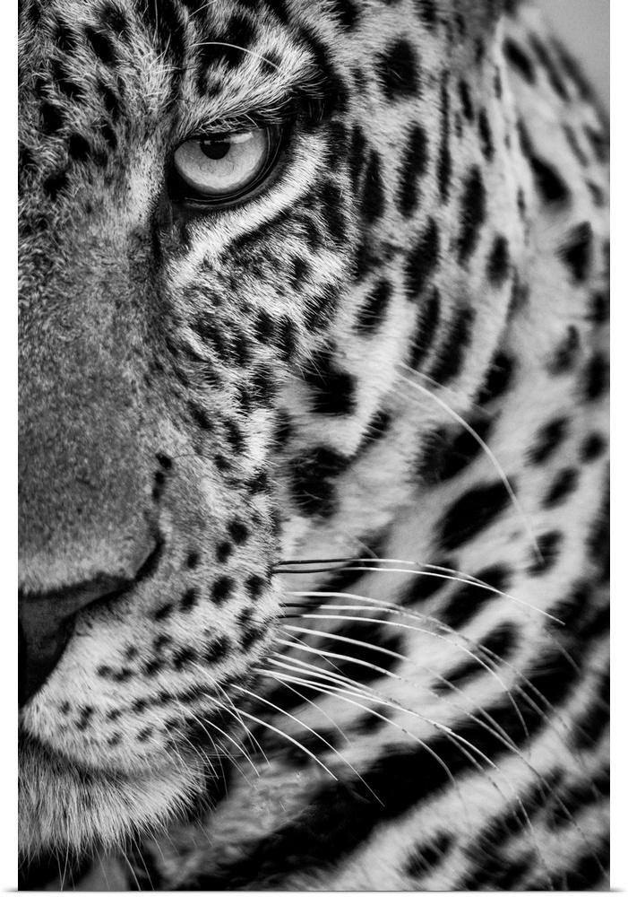 <p>Monochrome close-up of half male leopard (panthera pardus) face. Cottar's 1920s safari camp, Maasai mara national reserve, Kenya.</p>