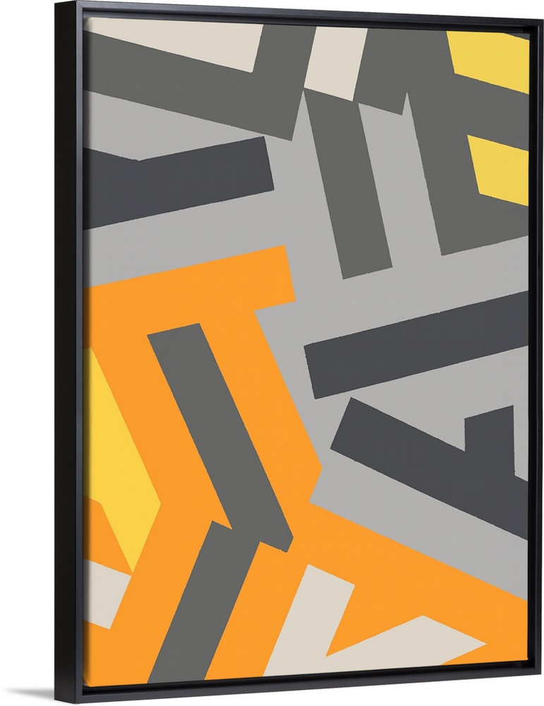 <p>Large abstract painting created with orange, yellow, and grey geometric shapes fitting together like a puzzle.</p>