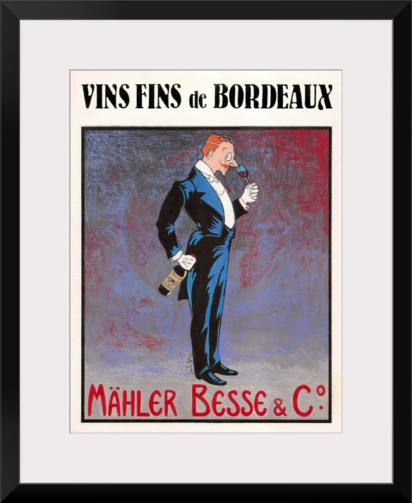<p>French poster advertising wine with a man wearing a tuxedo and a monocle smelling a glass of red wine.</p>