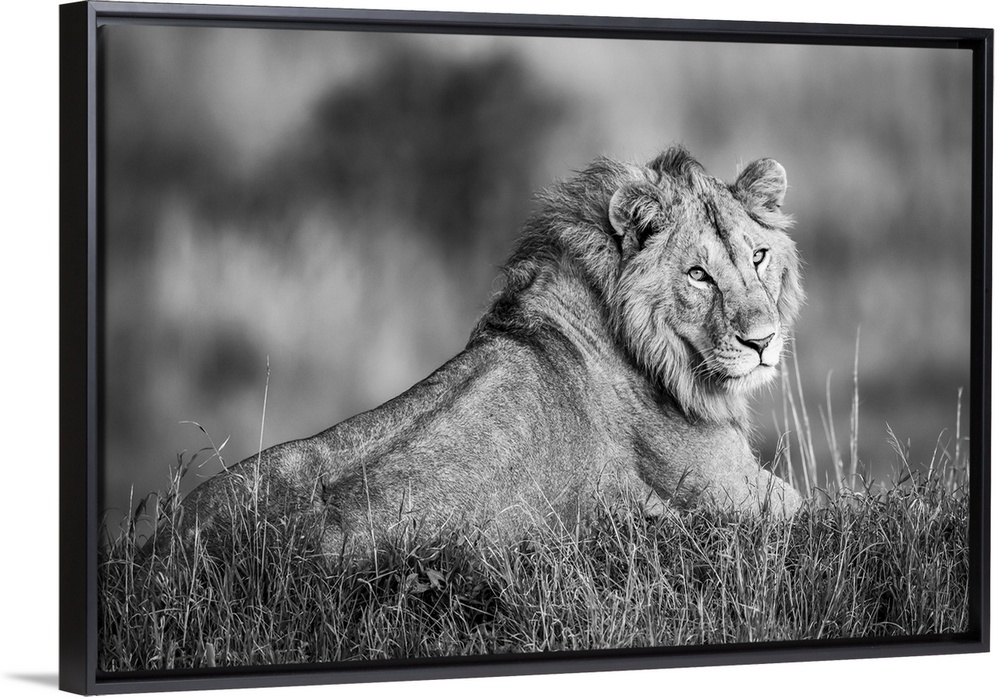 <p>Monotone male lion (panthera leo) lies turning to camera, Serengeti, Tanzania.</p>
