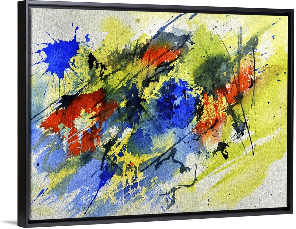 <p>Abstract painting in shades of black, blue, red and yellow with splatters of paint overlapping.</p>