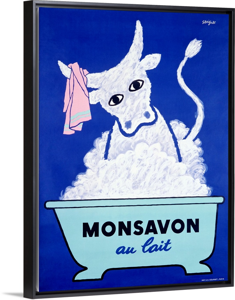 <p>Old poster artwork showing a bull in a bubble bath with wash cloth hanging from its horns.</p>