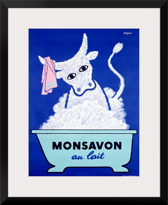 <p>Old poster artwork showing a bull in a bubble bath with wash cloth hanging from its horns.</p>