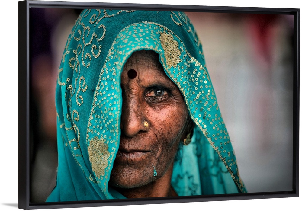<p>Portrait of an elderly woman wearing a turquoise embroidered veil.</p>