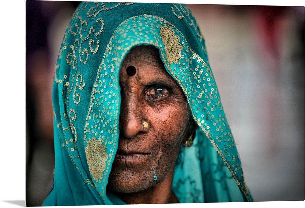<p>Portrait of an elderly woman wearing a turquoise embroidered veil.</p>