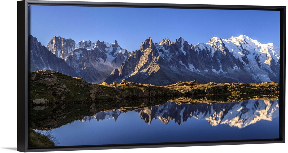 <p>The Mont Blanc mountain range reflected in the waters of Lac de Chesery at sunrise. Haute Savoie France Europe.</p>