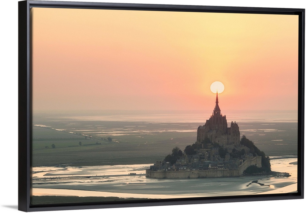 <p>The sun appearing to rest on the spire at the top of Mont Saint Michel in France at sunset.</p>