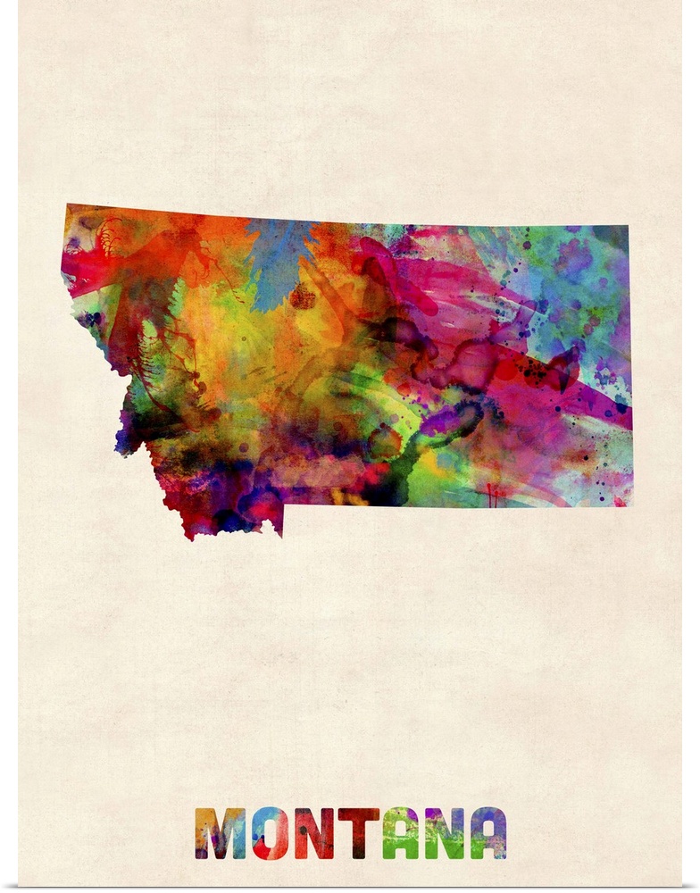<p>Contemporary piece of artwork of a map of Montana made up of watercolor splashes.</p>