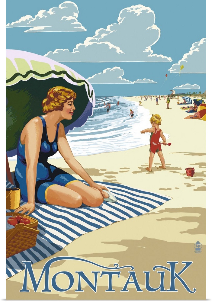 <p>Retro stylized art poster of a woman sitting on a blanket under an umbrella on the beach.</p>
