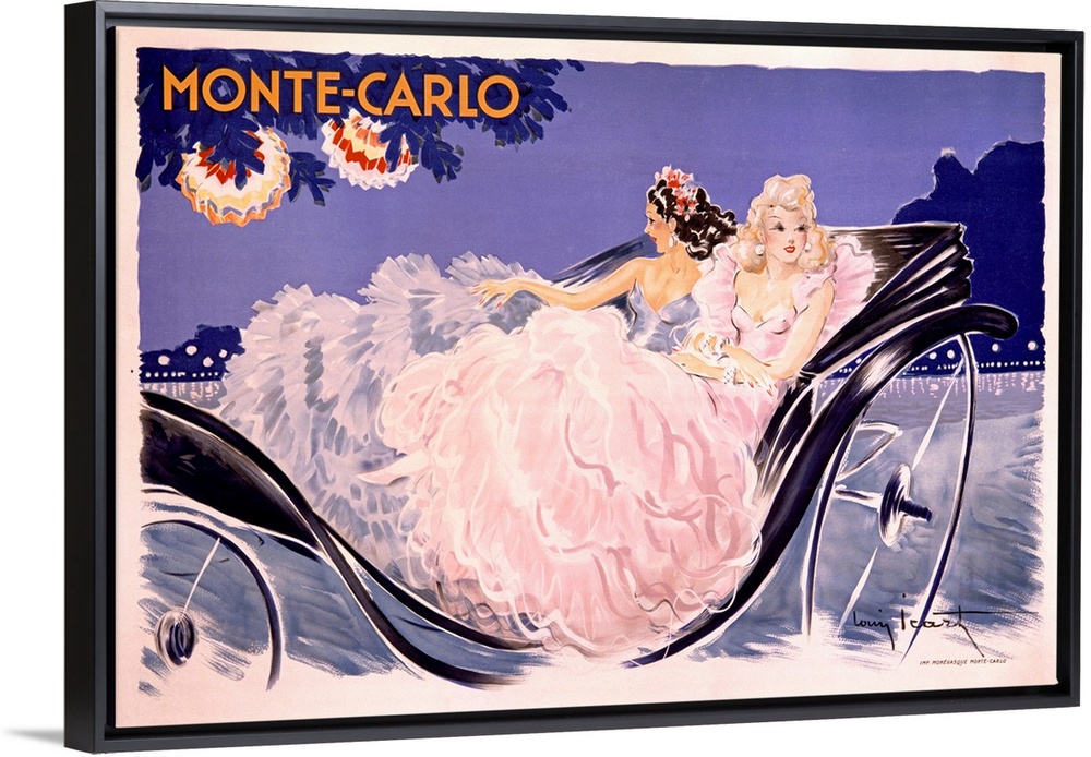 <p>Antiqued poster painting of two women in fancy dresses riding in a carriage.</p>