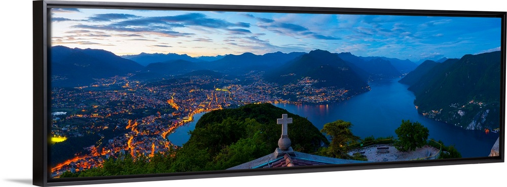 <p>Elevated view over Lugano from Monte San Salvatore illuminated at Dusk, Lake Lugano, Ticino, Switzerland.</p>