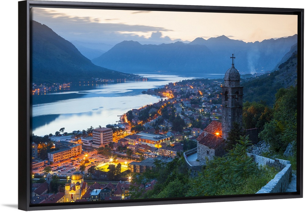 <p>Montenegro, Kotor Bay, Kotor, Balkans, Adriatic Coast, Stari Grad (Old Town) and The Bay of Kotor illuminated at dusk.</p>