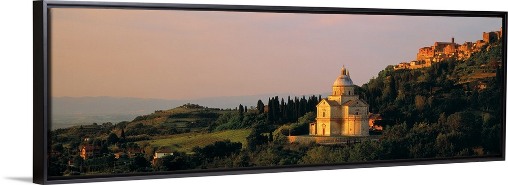 <p>Panoramic photograph of a medieval and Renaissance hill town and commune in the Italian province of Siena in southern Tuscany. There are rolling hills covered in tall cypress trees.</p>