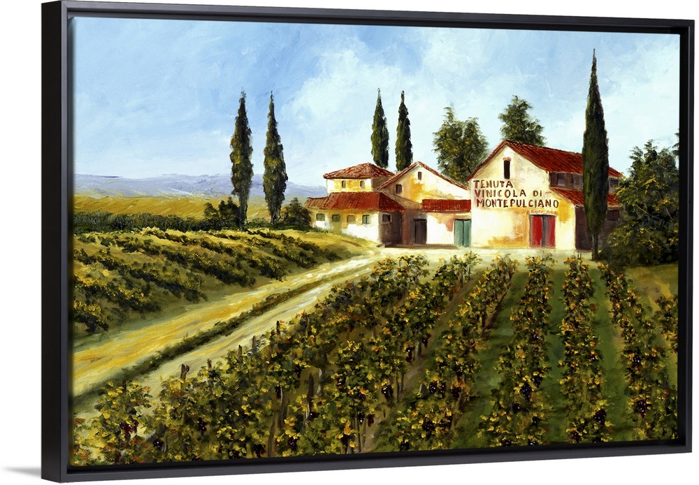 <p>Big painting of grape fields and a large compund on a clear, sunny day.</p>