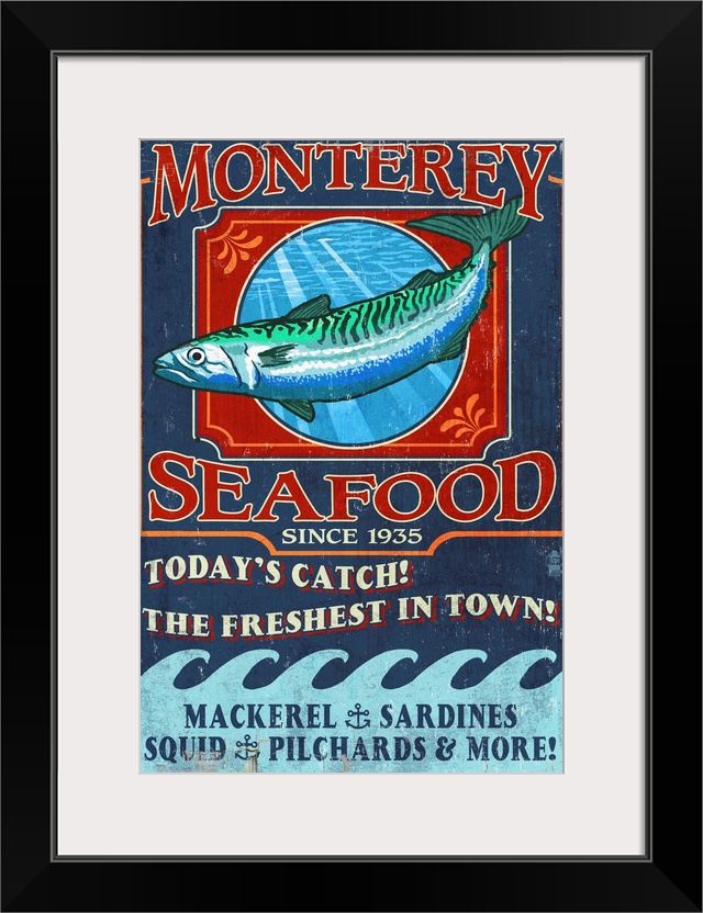 <p>Retro stylized art poster of a vintage seafood market sign displaying a mackerel.</p>