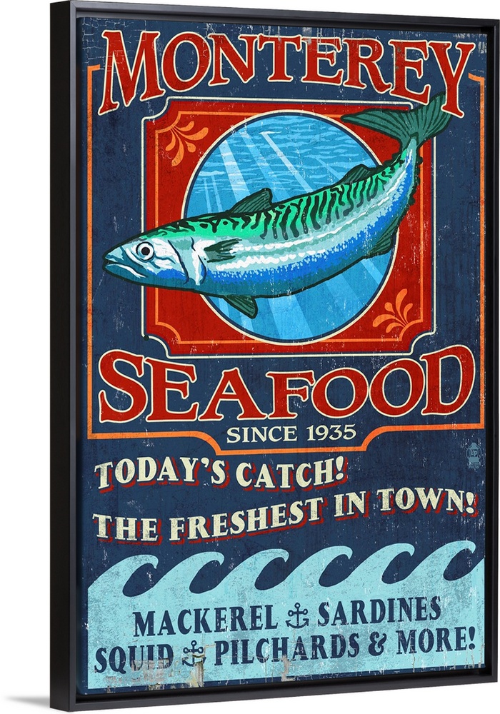 <p>Retro stylized art poster of a vintage seafood market sign displaying a mackerel.</p>