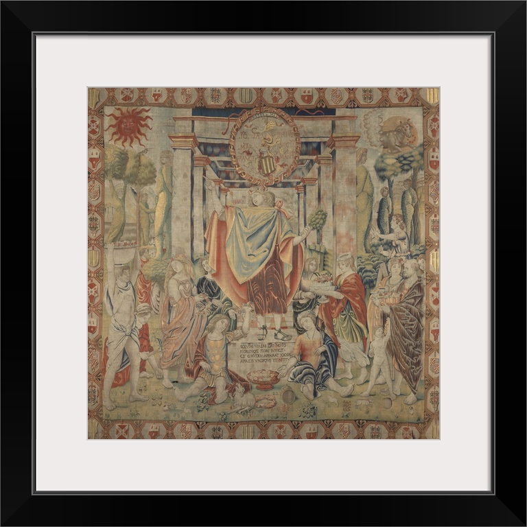 <p>April (Aprile), by Benedetto da Milano upon drawing by Bramantino, c. 1503-1508, 16th Century, tapestry, Whole artwork view. Allegory of the month of April, celebrating the come back of the spring; in the middle of the scene, a big coat of arms of the lineage of Gian Giacomo Trivulzio, the governor of Milan; under the emblem stands up the personification of the month, represented by a young man with curly blond hair, crowned with roses, keeping a small branch of basil and pointing out the index of his right hand toward the sun; in the surrounding well-finished garden, which is embellished with sculptures pruned according to human features, gardeners, valets and nymphs bustle about bringing baskets full of fruits and flowers; in the foreground, at the feet of the basement on which is placed the statue, are sitting a boy and a girl with wreaths; the composition is completed by a red sun with a human face on the left upper corner and the Taurus zodiac sign on the opposite side., Tapestry, 1503, Sforza Castle, Milan, Lombardy, Italy.</p>