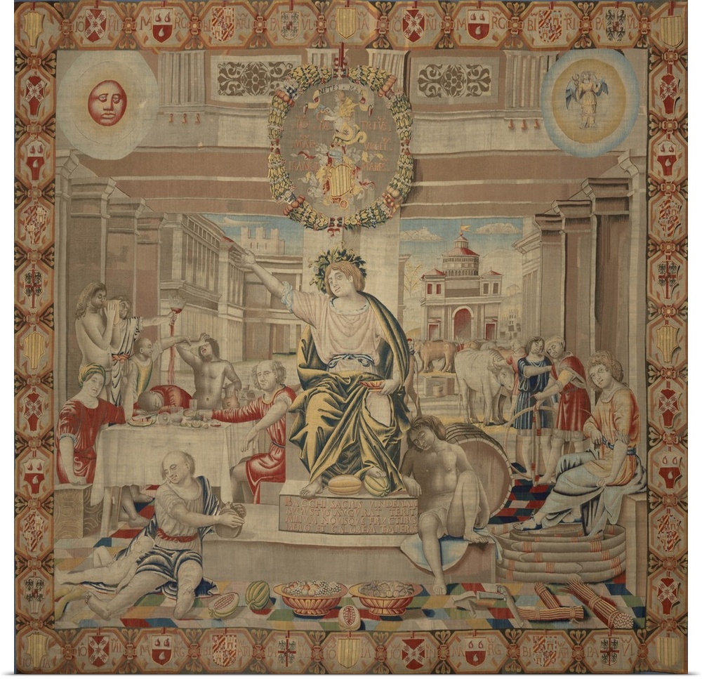 <p>August (Agosto), by Benedetto da Milano upon drawing by Bramantino, c. 1503-1508, 16th Century, tapestry, Whole artwork view. Allegory of the month of August; up in the middle, a big coat of arms of the lineage of Gian Giacomo Trivulzio, the governor of Milan; under the emblem there is the personification of the month, sitting on a throne and crowned with vine leaves; on his left some craftsmen are building barrels, while on his right a group of people are sitting around a table after a meal of melons and wine; the scene takes place under a portico framing a Renaissance square landscape, in the background; the composition is completed by a red sun with a human face on the left upper corner and by the Virgo zodiac sign on the opposite side., Tapestry, 1503, Sforza Castle, Milan, Lombardy, Italy.</p>