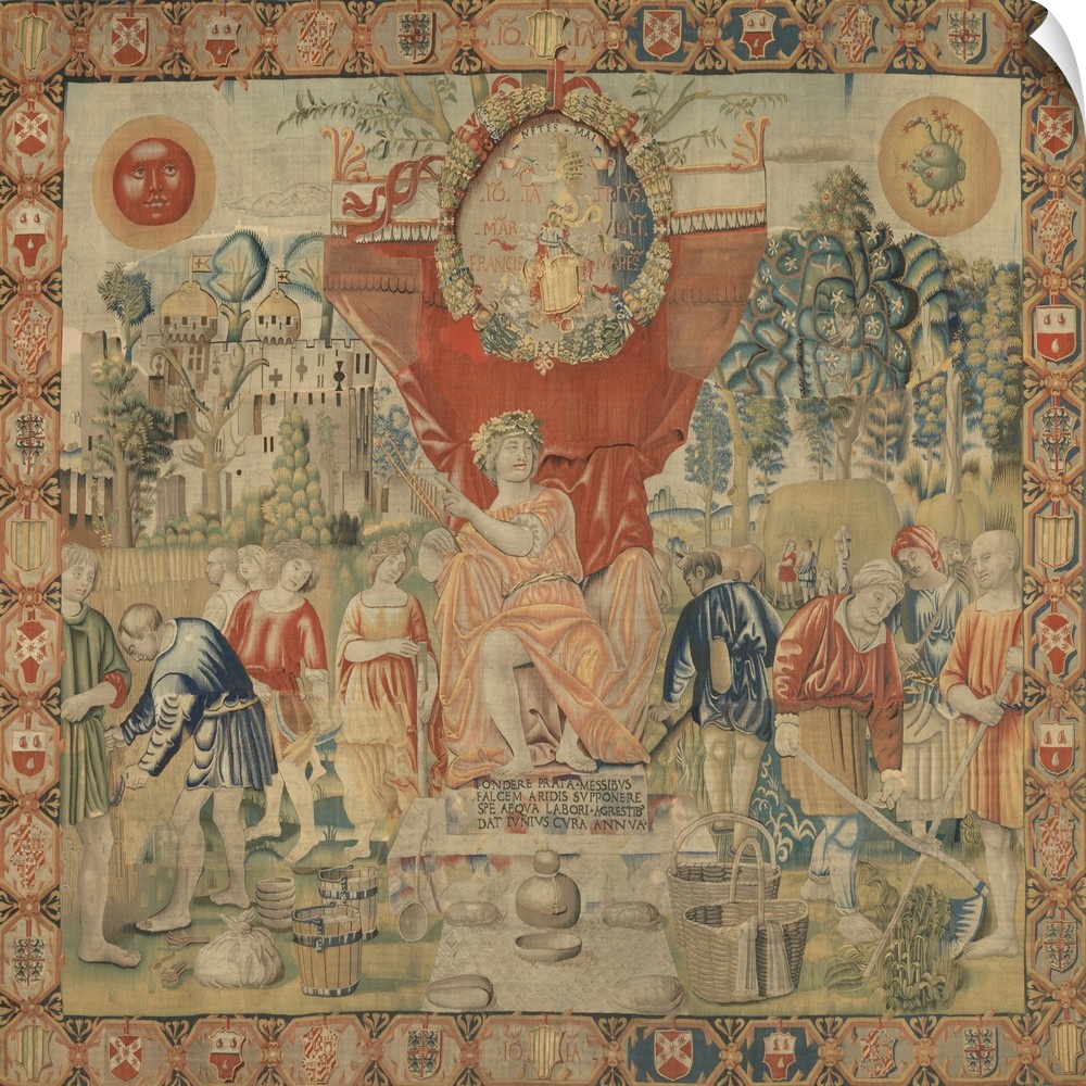 <p>June (Giugno), by Benedetto da Milano upon drawing by Bramantino, c. 1503-1508, 16th Century, tapestry, Whole artwork view. Allegorical representation of the month of June; up in the middle, a big coat of arms of the lineage of Gian Giacomo Trivulzio, the governor of Milan; under the emblem there is the personification of the month of June, represented as a king sitting on a throne with baldachin and sourrounded by farmers harvesting; in the foreground a prepared table for a pic-nic, baskets, tubs and some tools; in the background a citadel at the left and a forest at the right, a red sun with a human face on the left corner, and the Cancer zodiac sign on the right one., Tapestry, 1503, Sforza Castle, Milan, Lombardy, Italy.</p>