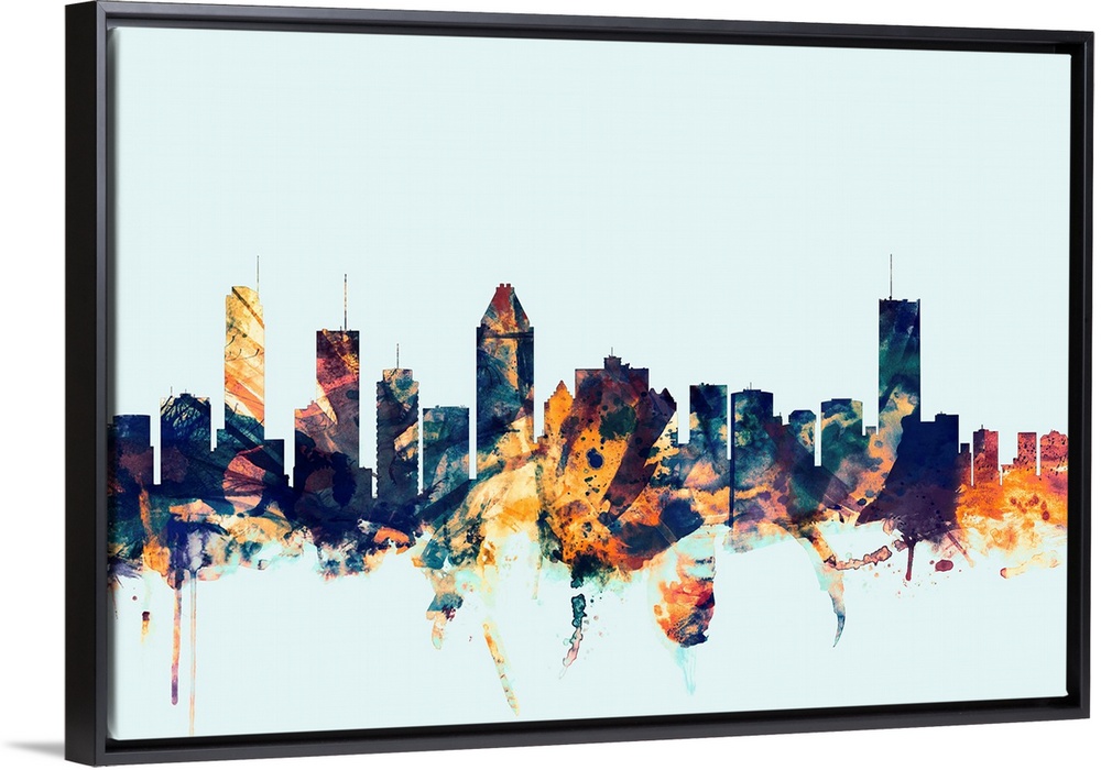 <p>Dark watercolor silhouette of the Montreal city skyline against a light blue background.</p>