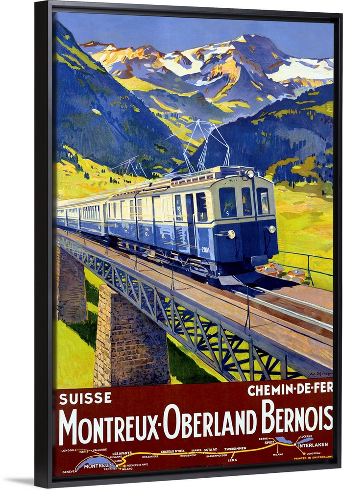 <p>Old advertising print for train. There is an image of train crossing a bridge with snow covered mountains in the distance.</p>