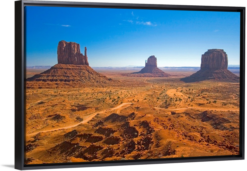 <p>Horizontal photograph from the National Geographic Collection of the vast, sandy landscape of Monument Valley, including the Three Mittens rock formations, beneath a clear blue sky.</p>