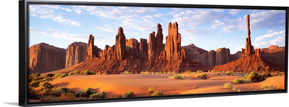<p>Panoramic photograph composed of a desert landscape filled with sand and small patches of vegetation. In the background there are large groupings of various jagged rock formations encompassing the desert.</p>