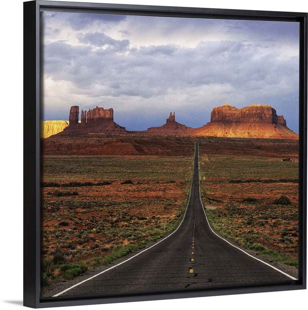 <p>A road leading towards the tall rock formations in Monument Valley, Arizona.</p>