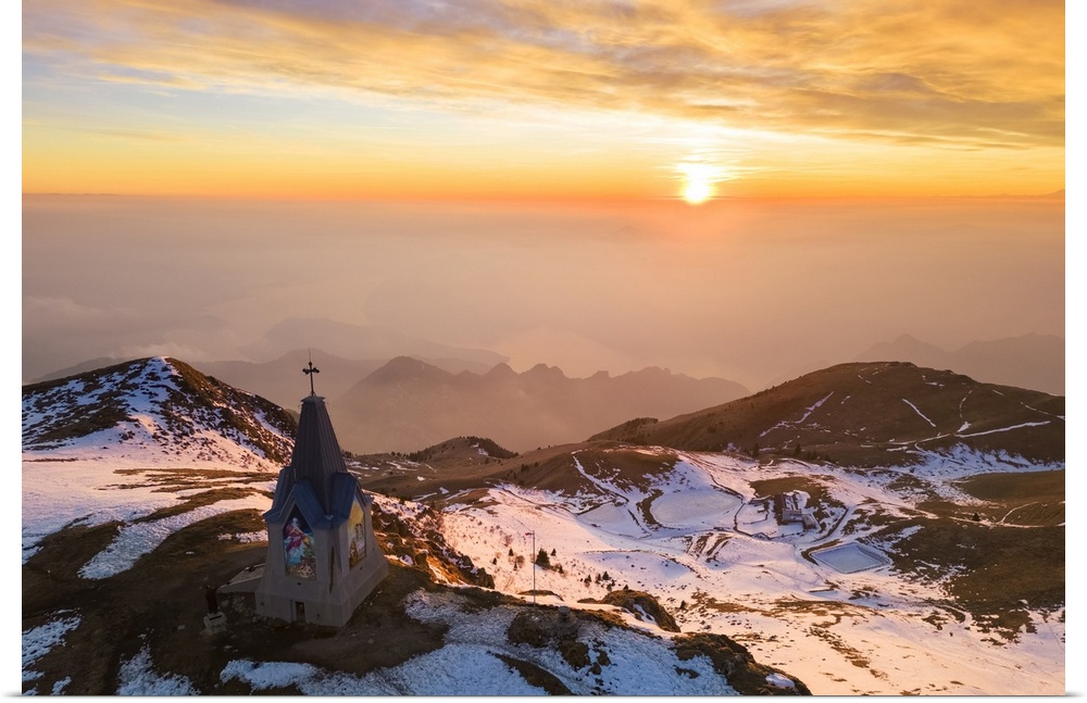 <p>Aerial view of a winter sunset over Monumento al Redentore chapel on the top of Mount Mount Guglielmo. Zone, Brescia province, Lombardy, Italy</p>