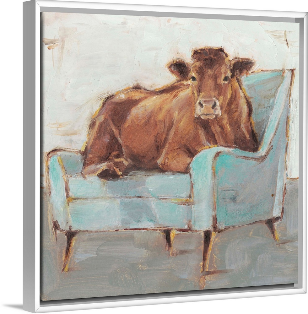 <p>A whimsical composition of a large brown cow lying comfortably on a pale blue armchair. With it's gold accents, this image is a little bit farmhouse, a little bit mid century, and a little bit glam. Perfect for a bedroom, bathroom or living room.</p>
