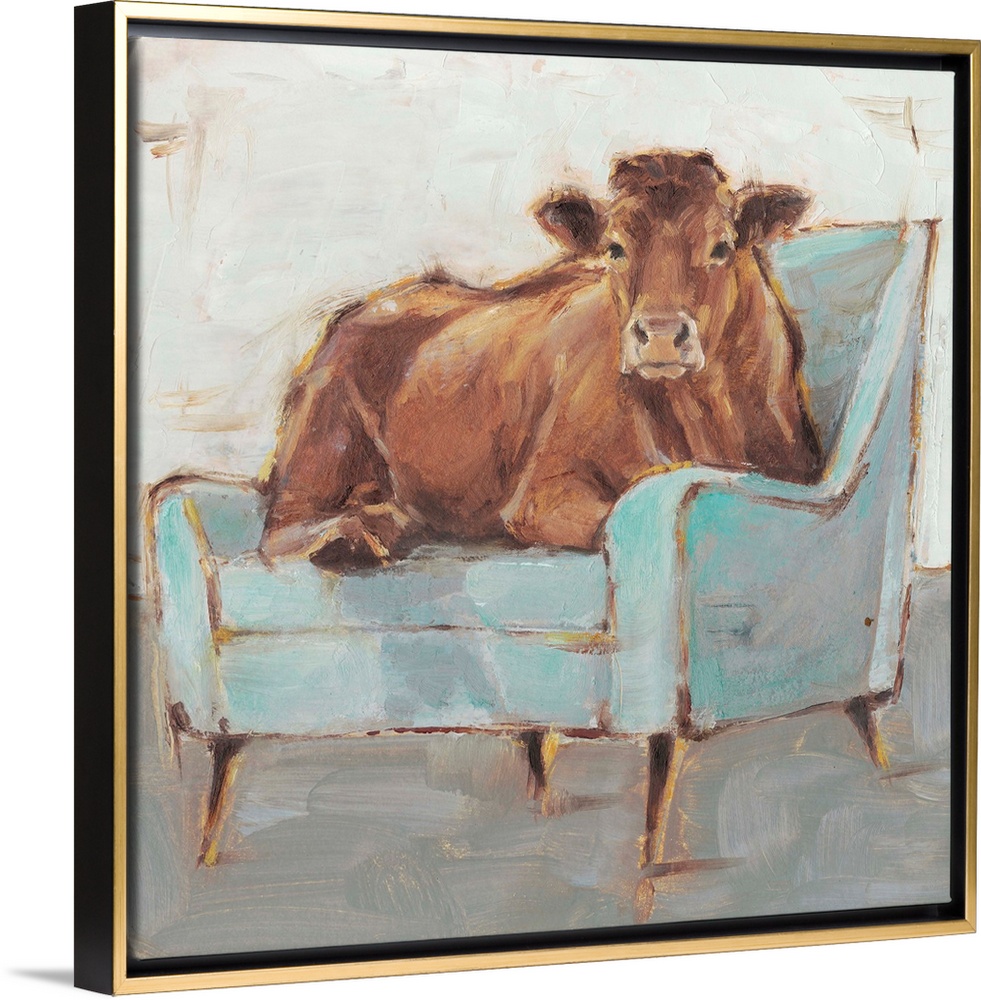 <p>A whimsical composition of a large brown cow lying comfortably on a pale blue armchair. With it's gold accents, this image is a little bit farmhouse, a little bit mid century, and a little bit glam. Perfect for a bedroom, bathroom or living room.</p>