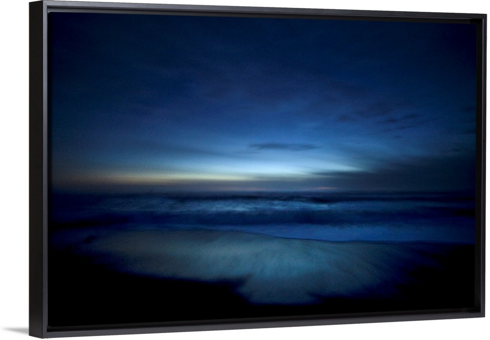 <p>Landscape, oversized photograph of deep blue ocean waters along the beach, surrounded by the darkness of dusk in Big Sur, California.</p>