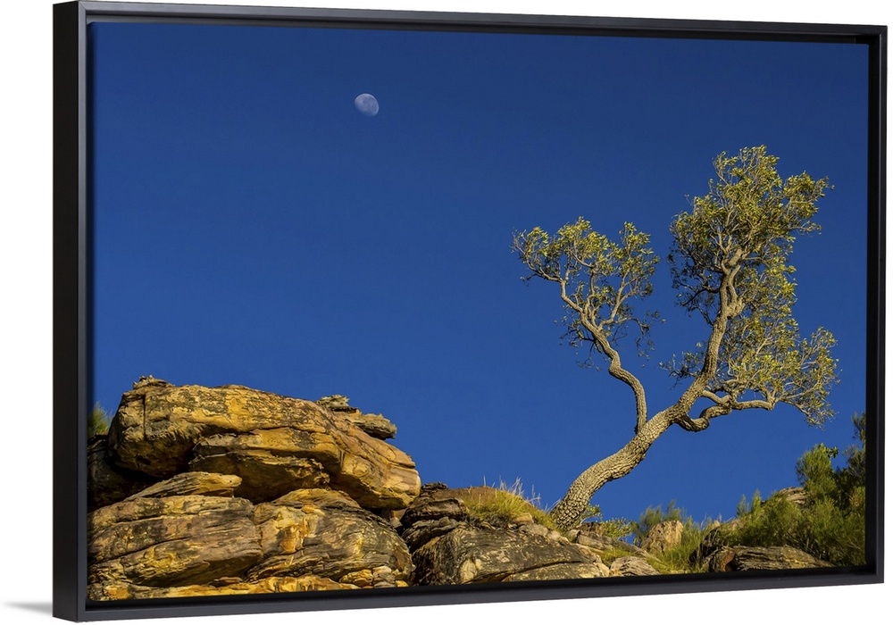 <p>A low angle view of a moon behind a sculptured tree near the King George River in the Kimberley Region of Northwest Australia.</p>