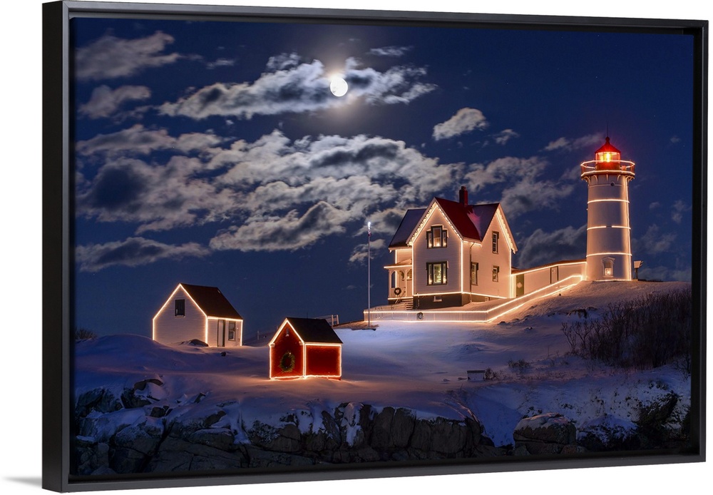 <p>Photograph of a lighthouse and other small building outlined in lights, under a bright moon and clouds at night.</p>