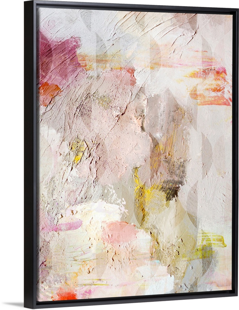 <p>A contemporary abstract painting featuring textured paint in shades of neutral with pink and green accents</p>