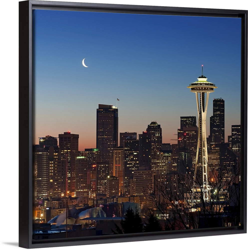 <p>This photograph taken at twilight shows the glowing city skyline available as square shaped wall art.</p>