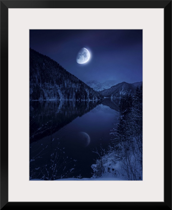 <p>Moon rising over tranquil lake in misty mountains.</p>