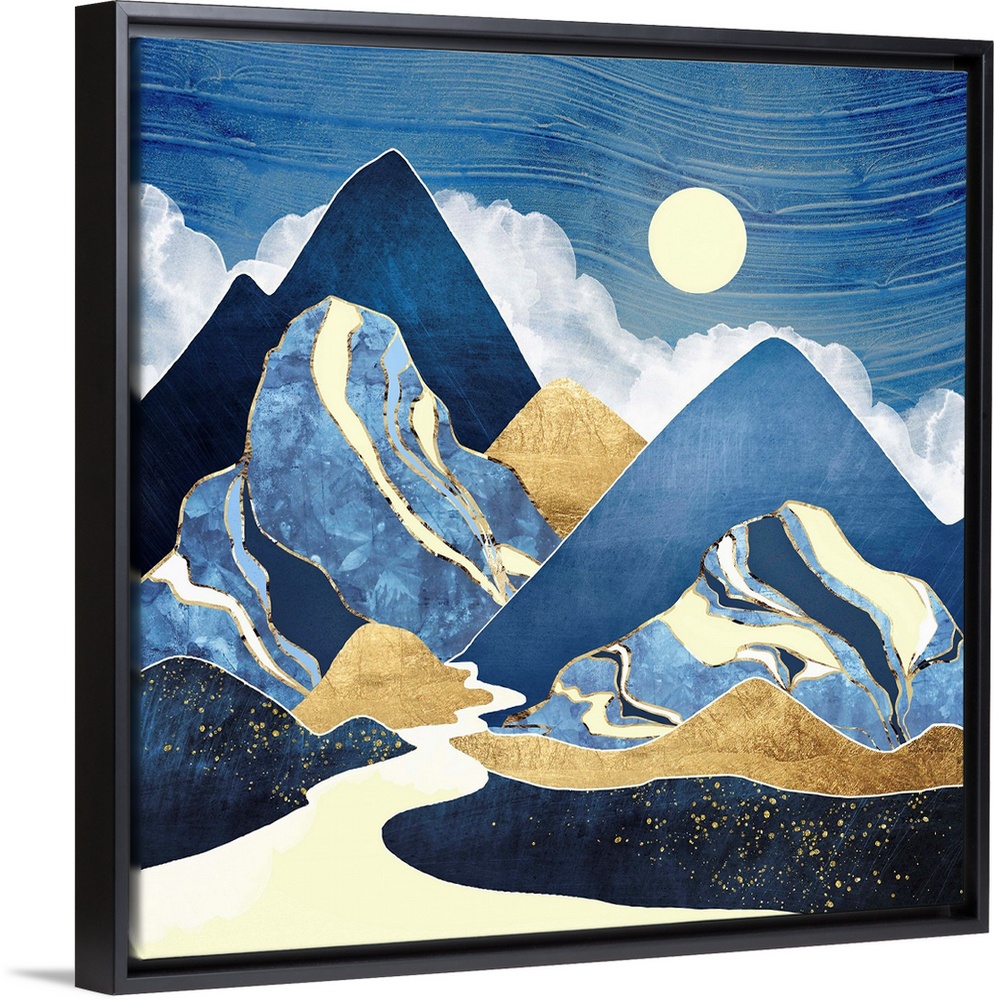 <p>Abstract landscape with mountains, river, moon, blue, gold and yellow.</p>
