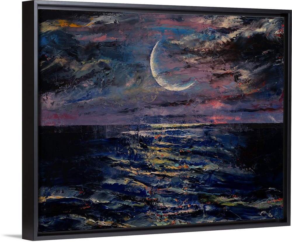 <p>A contemporary painting of a crescent moon above a sea.</p>
