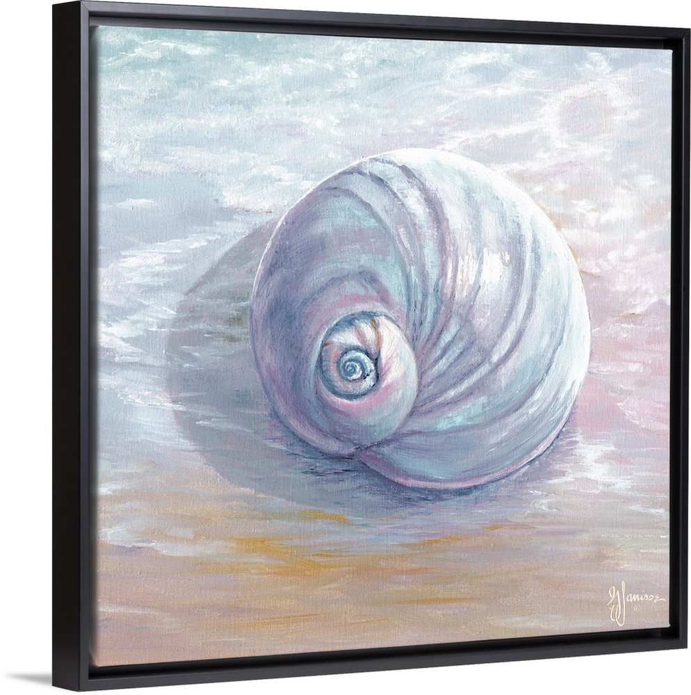 <p>Beach themed home decor art of a moon shell on a beach.</p>