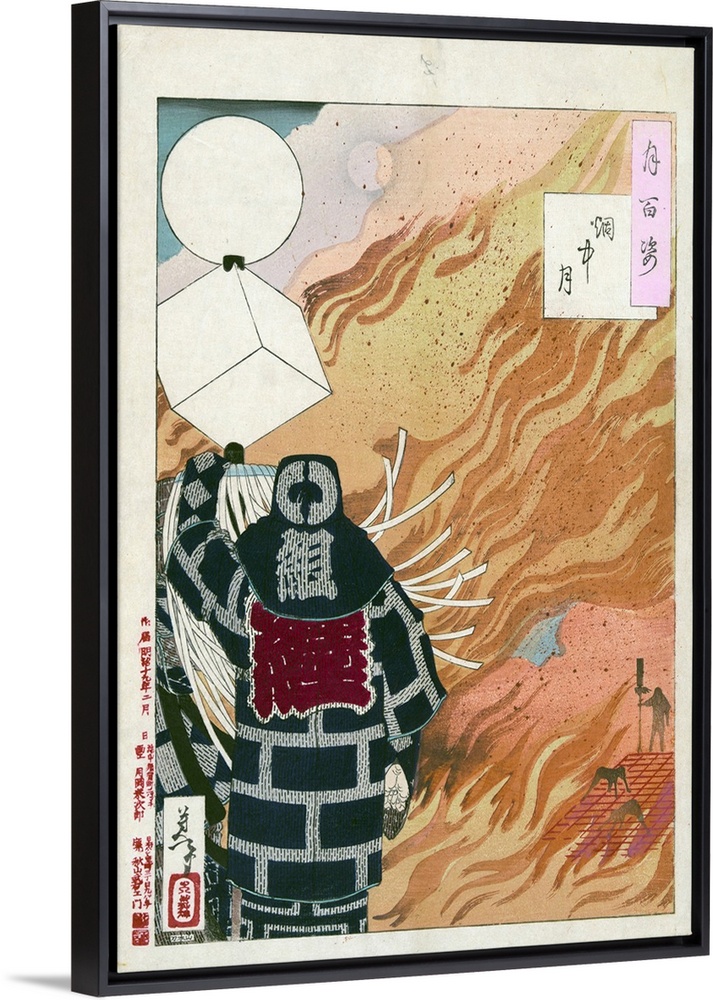 <p>Moon through the smoke of a blaze by Yoshitoshi Taiso. Woodcut, colour print of firemen standing on the rooftops of buildings, signalling to each other during a conflagration.</p>