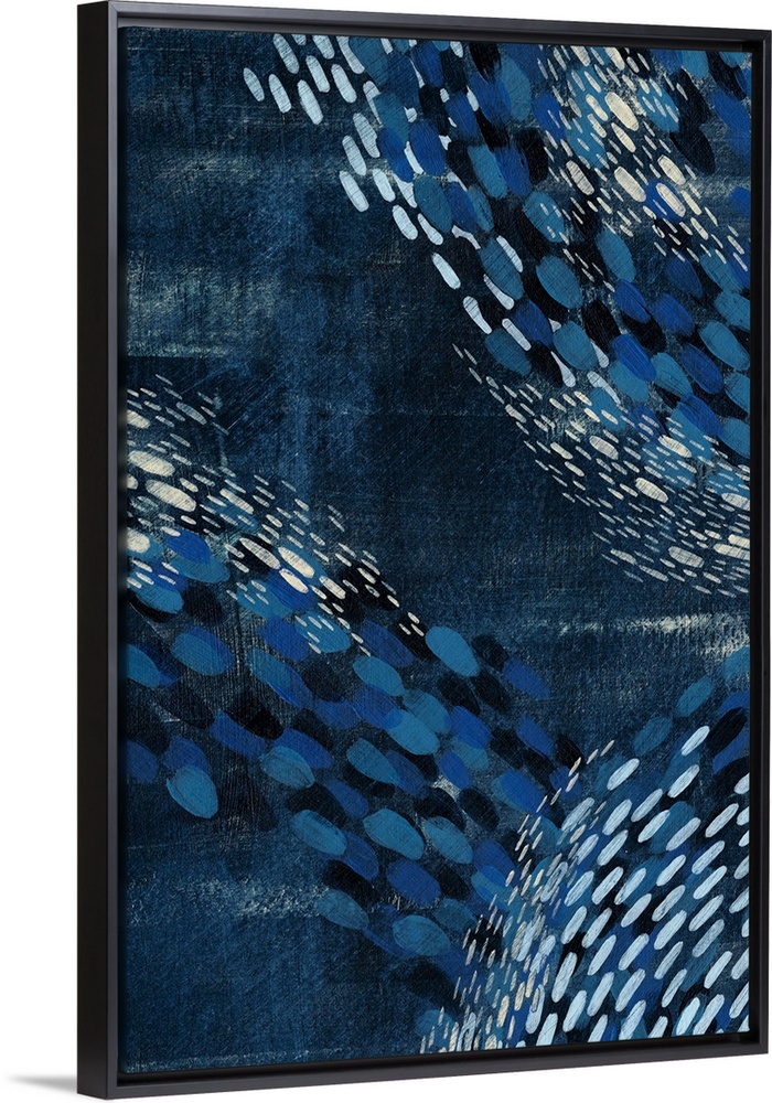 <p>Contemporary abstract painting in shades of deep blue with curving patterns.</p>