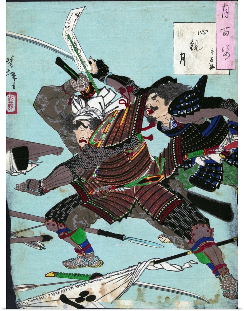 <p>Moon viewed through the heart by Yoshitoshi Taiso. Woodcut colour print shows two samurai warriors fighting among fallen weapons.</p>